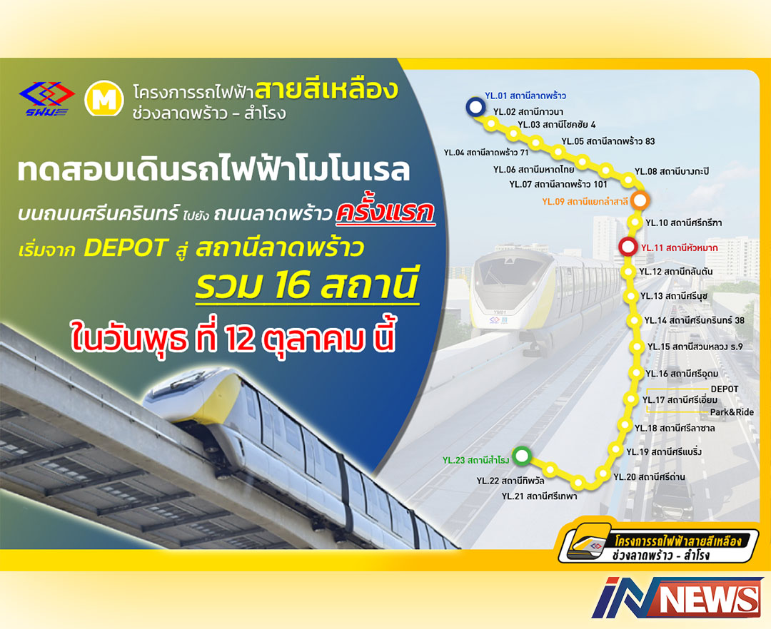 กรุงเทพฯ-รฟม. เริ่มขยายระยะทางทดสอบเดินรถไฟฟ้าโมโนเรลสายสีเหลือง จากถนนศรีนครินทร์ - ถนนลาดพร้าว เป็นครั้งแรกพร้อมชวนคุณ...