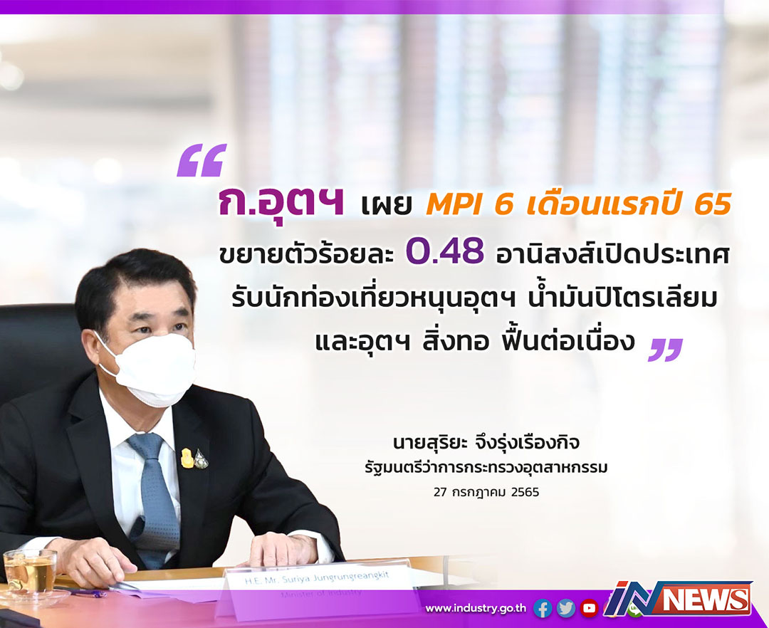 กรุงเทพฯ-กระทรวงอุตสาหกรรม (อก.) เผยดัชนีผลผลิตอุตสาหกรรม (MPI) ครึ่งปีแรก ปี 2565 ขยายตัวร้อยละ 0.48 เมื่อเทียบกับช่วงเ...
