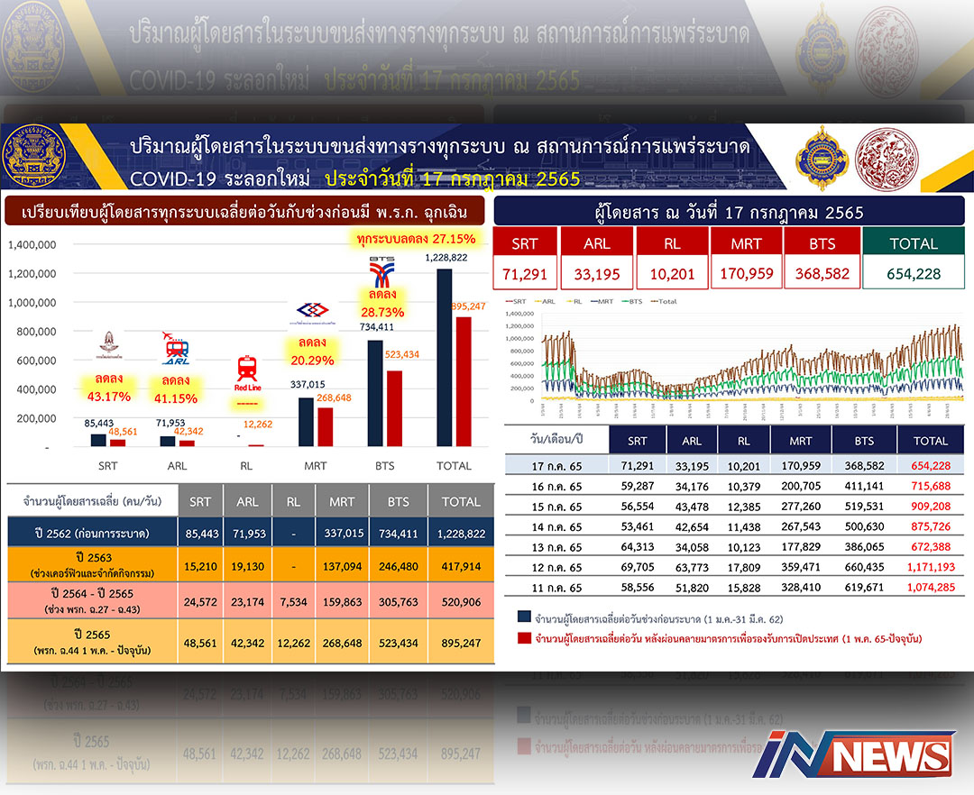 ขนส่งทางรางสรุปข้อมูลการเดินทางปชช. ใน17ก.ค.นี้รวมจำนวน654,228คน