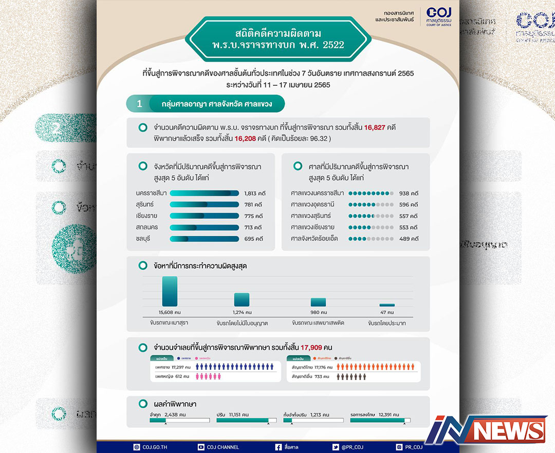 กรุงเทพฯ-สำนักงานศาลยุติธรรม เปิดเผยผลสรุปสถิติคดีความผิดตาม พ.ร.บ.จราจรทางบก พ.ศ. ๒๕๒๒ที่ขึ้นสู่การพิจารณาคดีของศาลชั้น...