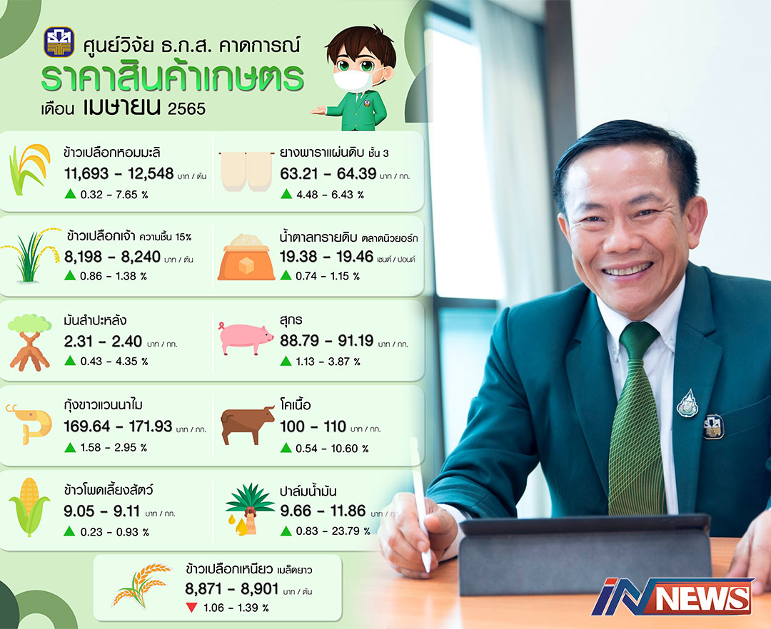 กรุงเทพฯ-ศูนย์วิจัยและพัฒนานวัตกรรม ธ.ก.ส. เผยในเดือนเม.ย. 2565 ราคาสินค้าส่วนใหญ่ปรับตัวสูงขึ้น เนื่องจากรัฐบาลเริ่มผ่อ...