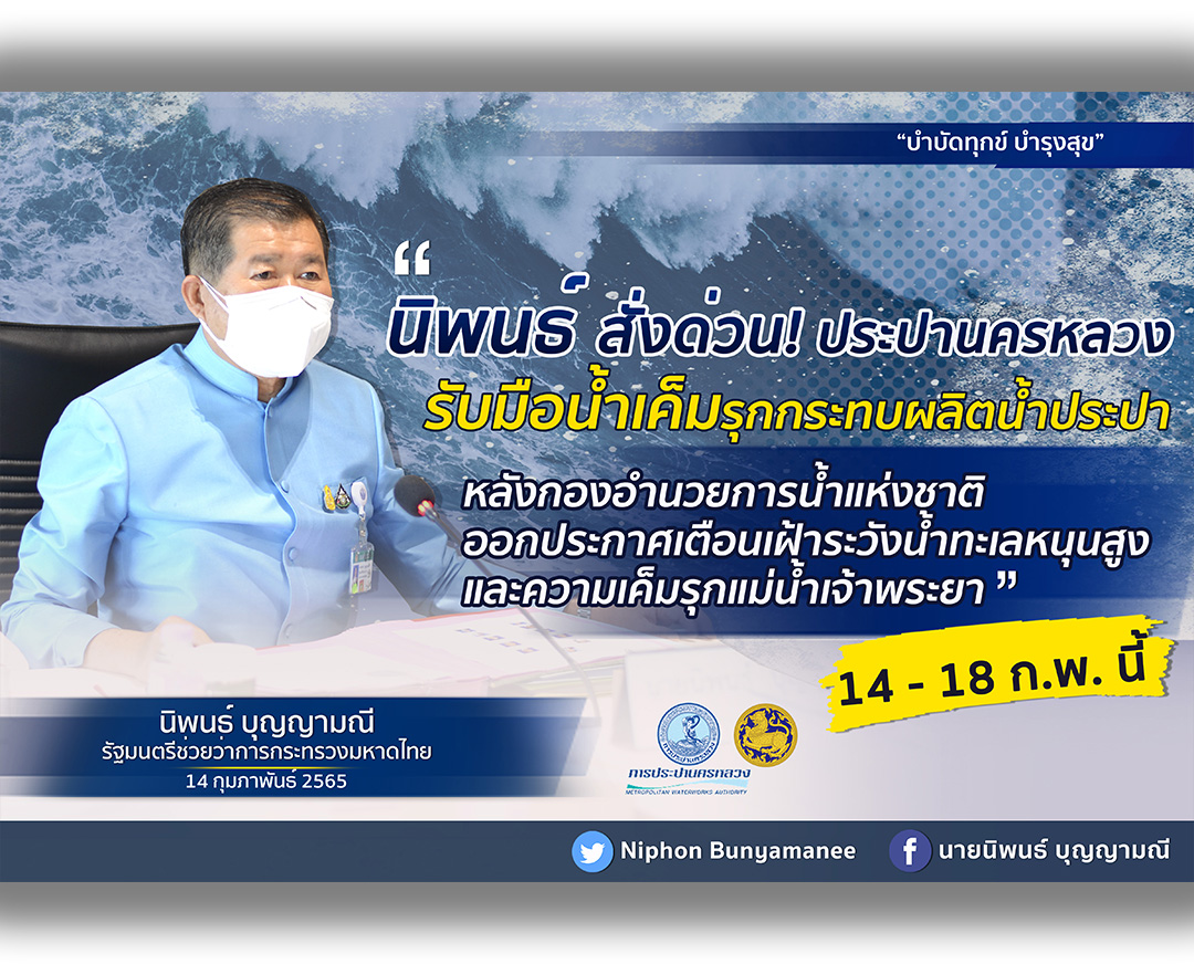 'นิพนธ์'สั่งด่วน!ประปานครหลวงรับมือ น้ำทะเลหนุนสูงน้ำเค็มทะลัก14-18 ก.พ