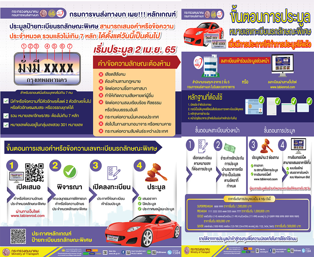 กรุงเทพฯ-กรมการขนส่งทางบกเผย หลักเกณฑ์ประมูลป้ายทะเบียนรถลักษณะพิเศษ สามารถเสนอคำหรือข้อความประจำหมวดที่ต้องการได้เอง ตั...