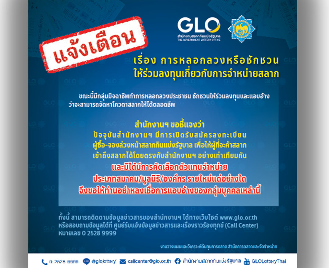 กองสลากฯเตือนประชาชนระวังการหลอก ชักชวนลงทุนจัดหาโควตาล็อตเตอรี่