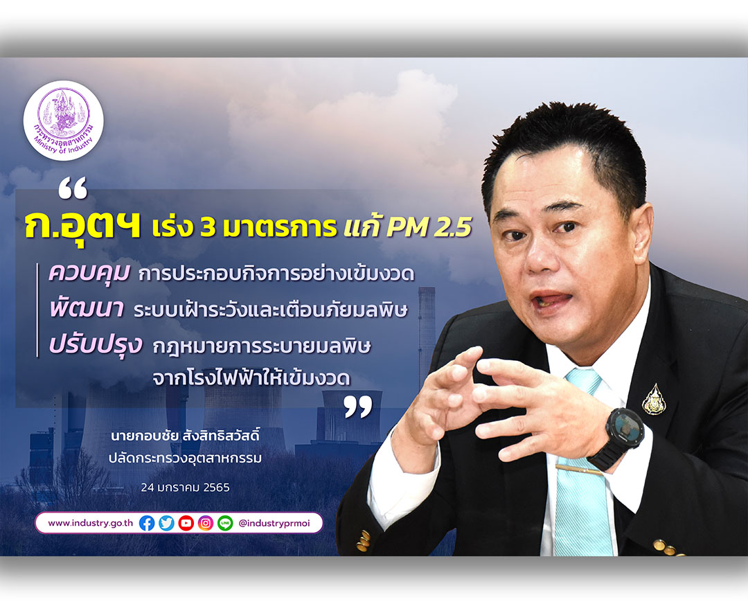 กรุงเทพฯ-ก.อุตฯ เร่ง 3 มาตรการ แก้ PM 2.5 ควบคุมการประกอบกิจการอย่างเข้มงวด พัฒนาระบบเฝ้าระวังและเตือนภัยมลพิษปรับปรุงกฎ...