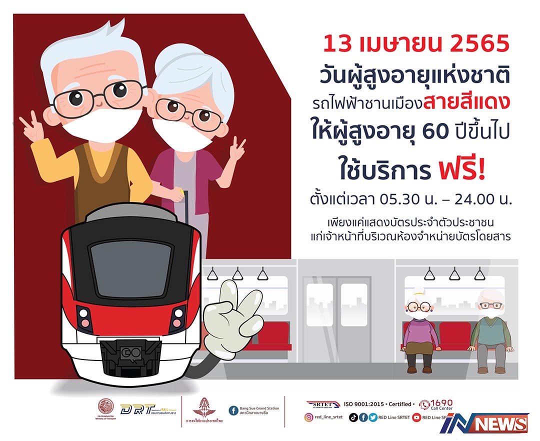 กรุงเทพฯ-รฟฟท.ให้ผู้สูงอายุ 60 ปีขึ้นไป ใช้บริการรถไฟฟ้าชานเมืองสายสีแดง ฟรี! 13 เมษายน 2565 พร้อมเน้นย้ำมาตรการป้องกันก...