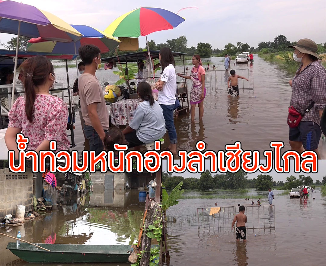 น่าเป็นห่วงอ่างลำเชียงไกลน้ำล้นสปิลเวย์ ด้านล่างและบนในสถานการณ์น้ำท่วม