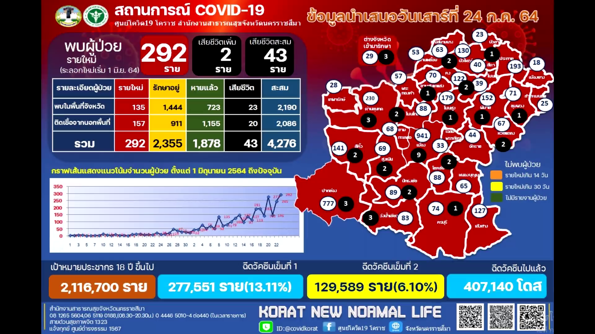 โควิดโคราชนิวไฮทุกวันวันนี้พุ่งอีก292คน คลัสเตอร์ตลาดสดปากช่องมาแรง