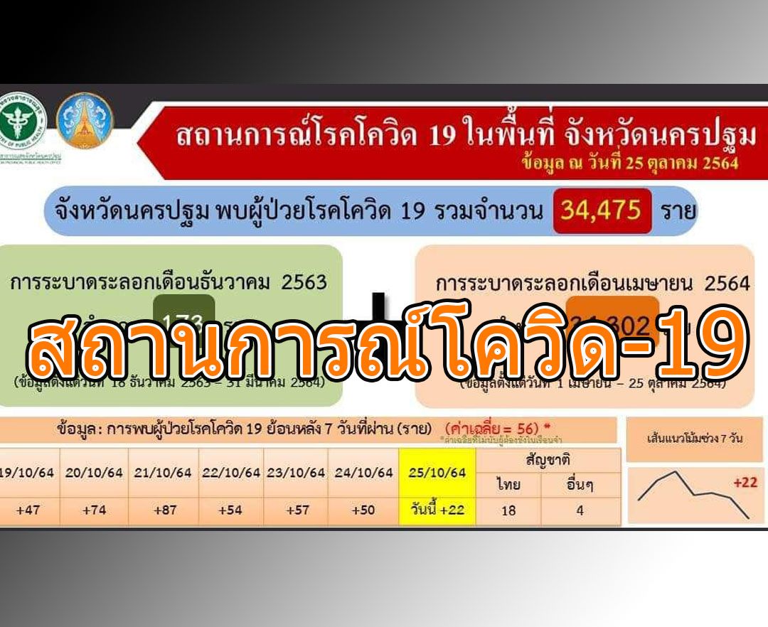 โควิดนครปฐมสถานการณ์ดีขึ้นต่อเนื่อง ล่าสุดพบผู้ติดเชื้อลดลงเหลือ25ราย