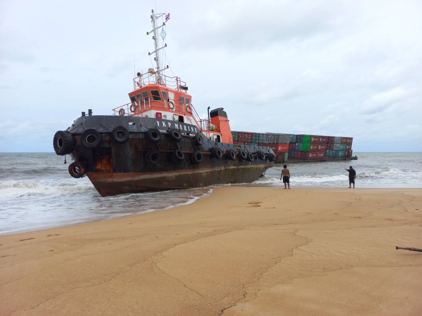 พังงา-คลื่นซัดเรือบรรทุกตู้คอนเทนเนอร์เกยตื่นฝั่งทิศตะวันตกของเกาะพระทอง พื้นที่ ต.เกาะพระทอง อ.คุระบุรี จ.พังงา เบื้องต...