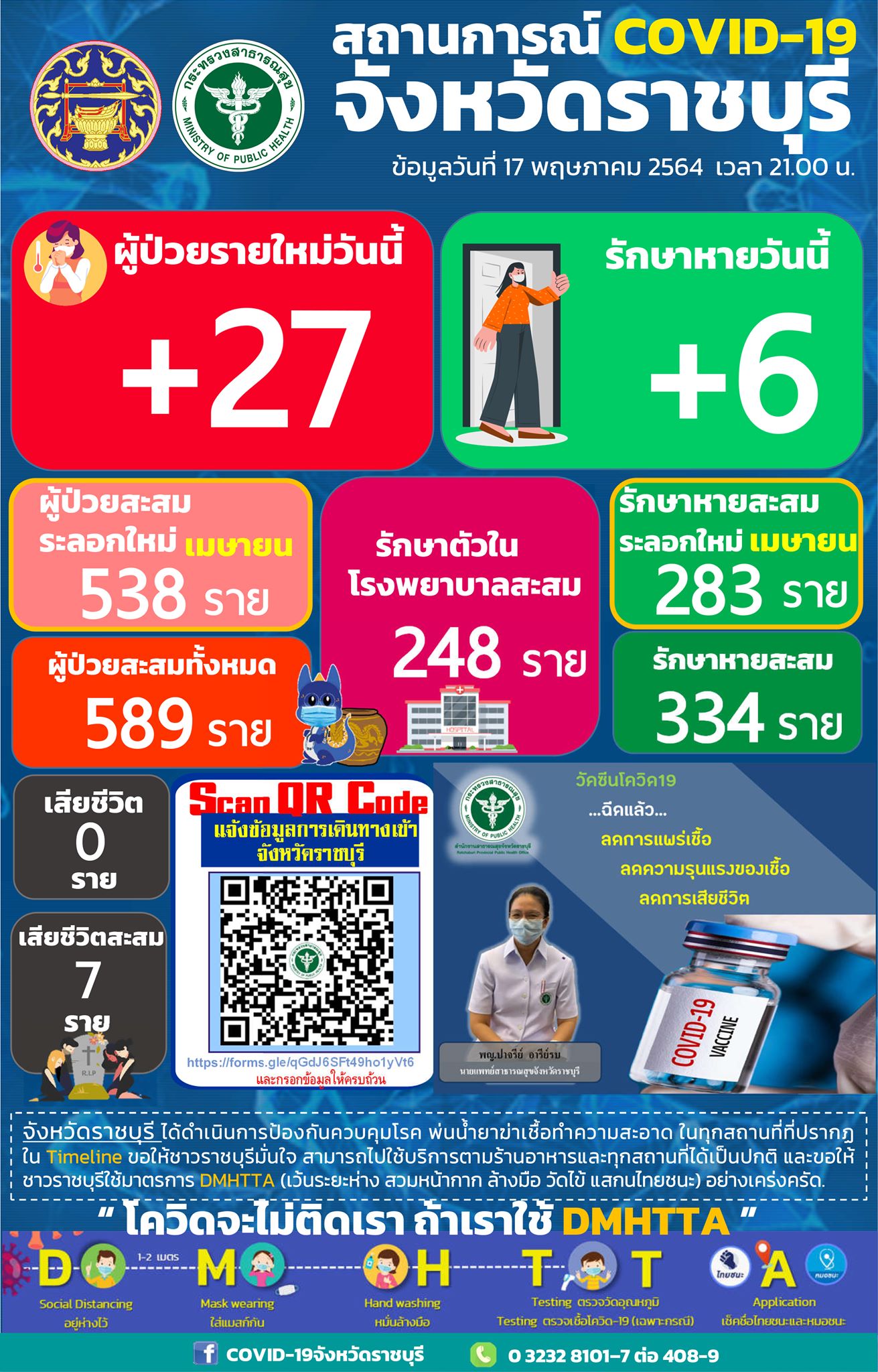 ราชบุรี-พบยอดผู้ป่วยติดเชื้อโควิด-19 รายใหม่ 27 ราย ยอดรวมติดเชื้อสะสมรวม 589 ราย เข้ารับการรักษาอยู่ในรพ. 248 ราย รักษา...