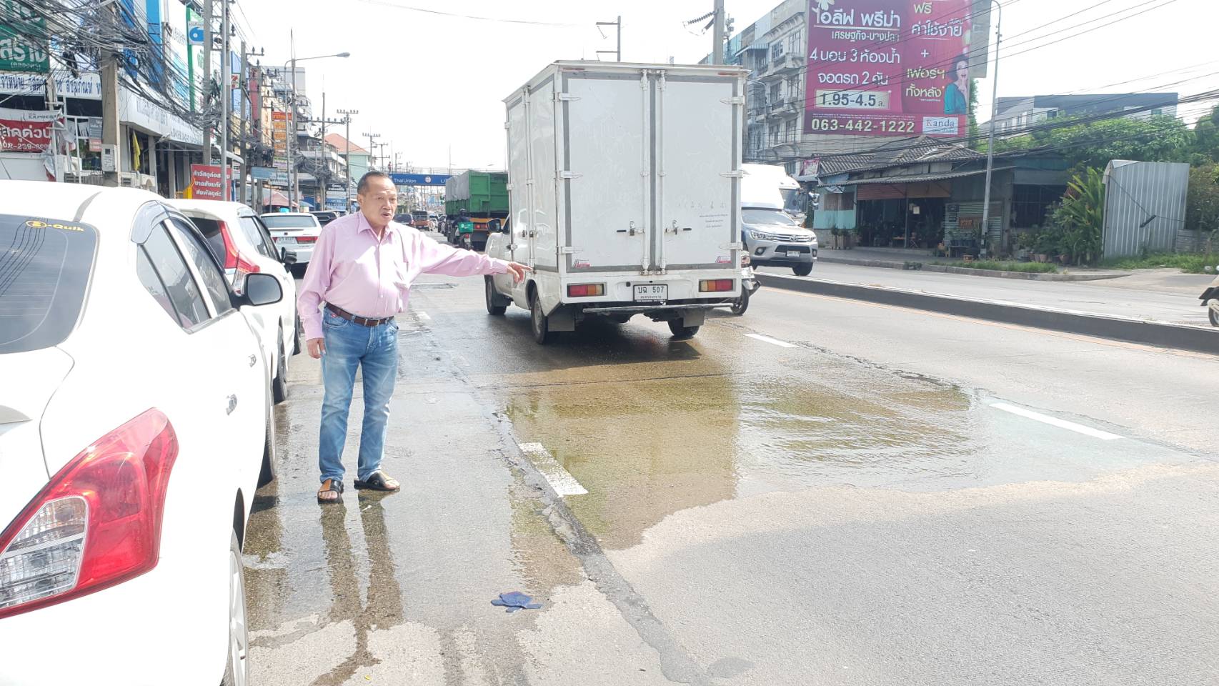 สมุทรสาคร-วอนหน่วยงานที่เกี่ยวข้องแก้ไขท่อประปาแตกด่วนหลังมีรถจักรยานยนต์ประสบเหตุหลายรายแล้วเนื่องจากถนนลื่น