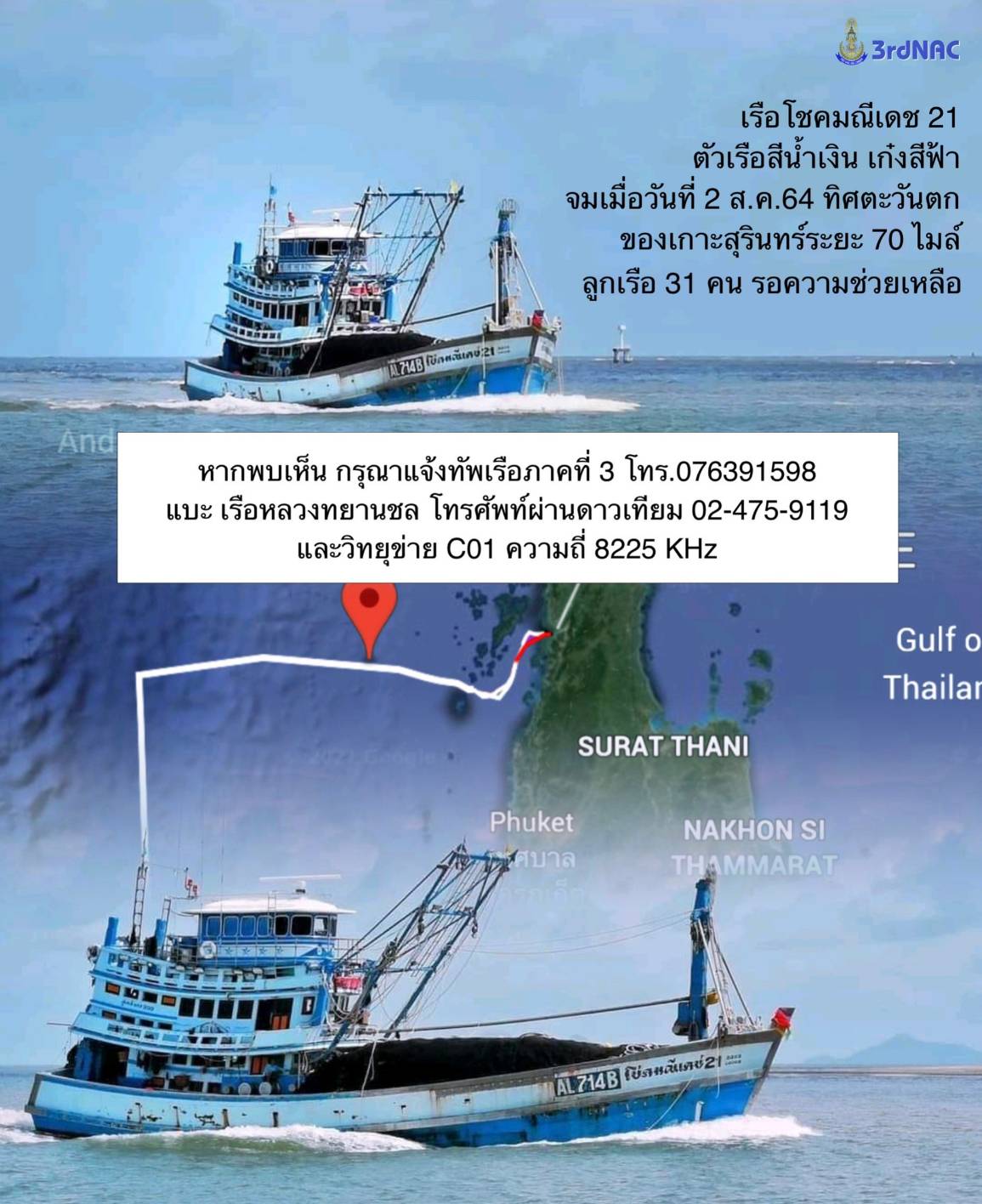 พังงา-คลื่นแรงจัด เรือประมงจมกลางทะเลลึกบริเวณ ทิศตะวันตกเฉียงเหนือของเกาะสุรินทร์ ระยะประมาณ 70 ไมล์ทะเล แนวเส้นขอบชายแ...