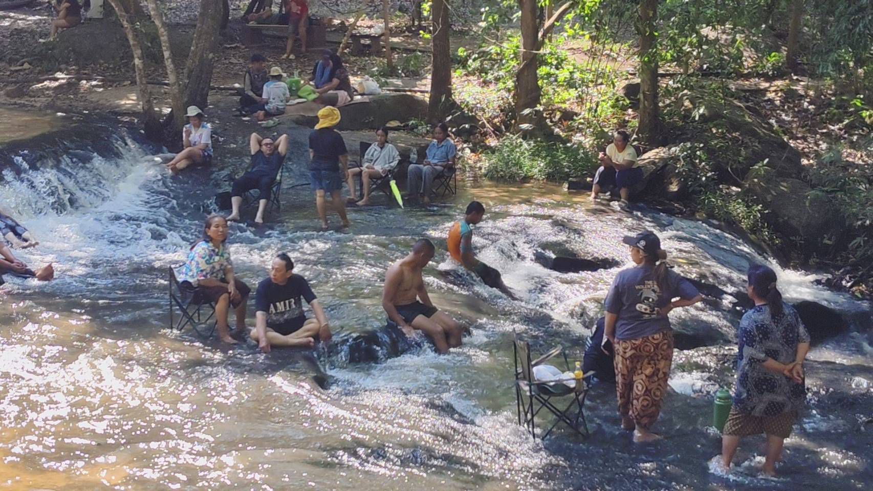 ชาวขุนหาญหอบลูกจูงหลานหนีร้อนมา พึ่งเย็นเล่นน้ำตกสำโรงเกียรติคึกคัก