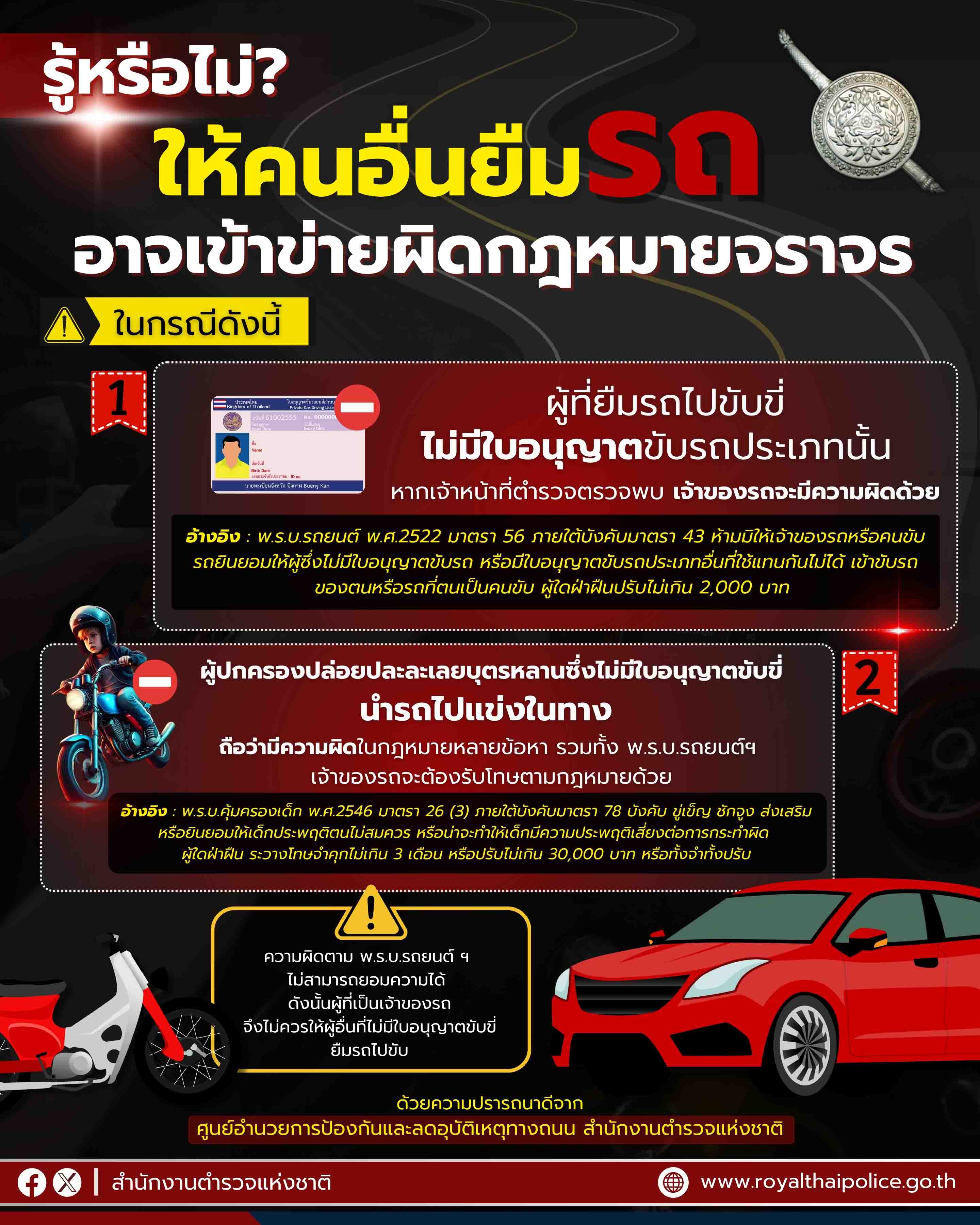 กรุงเทพฯ-ศูนย์อำนวยการป้องกันและลดอุบัติเหตุทางถนน สำนักงานตำรวจแห่งชาติ เตือนอย่าให้ผู้อื่นยืมรถไปขับ โดยเฉพาะผู้ไม่มีใ...