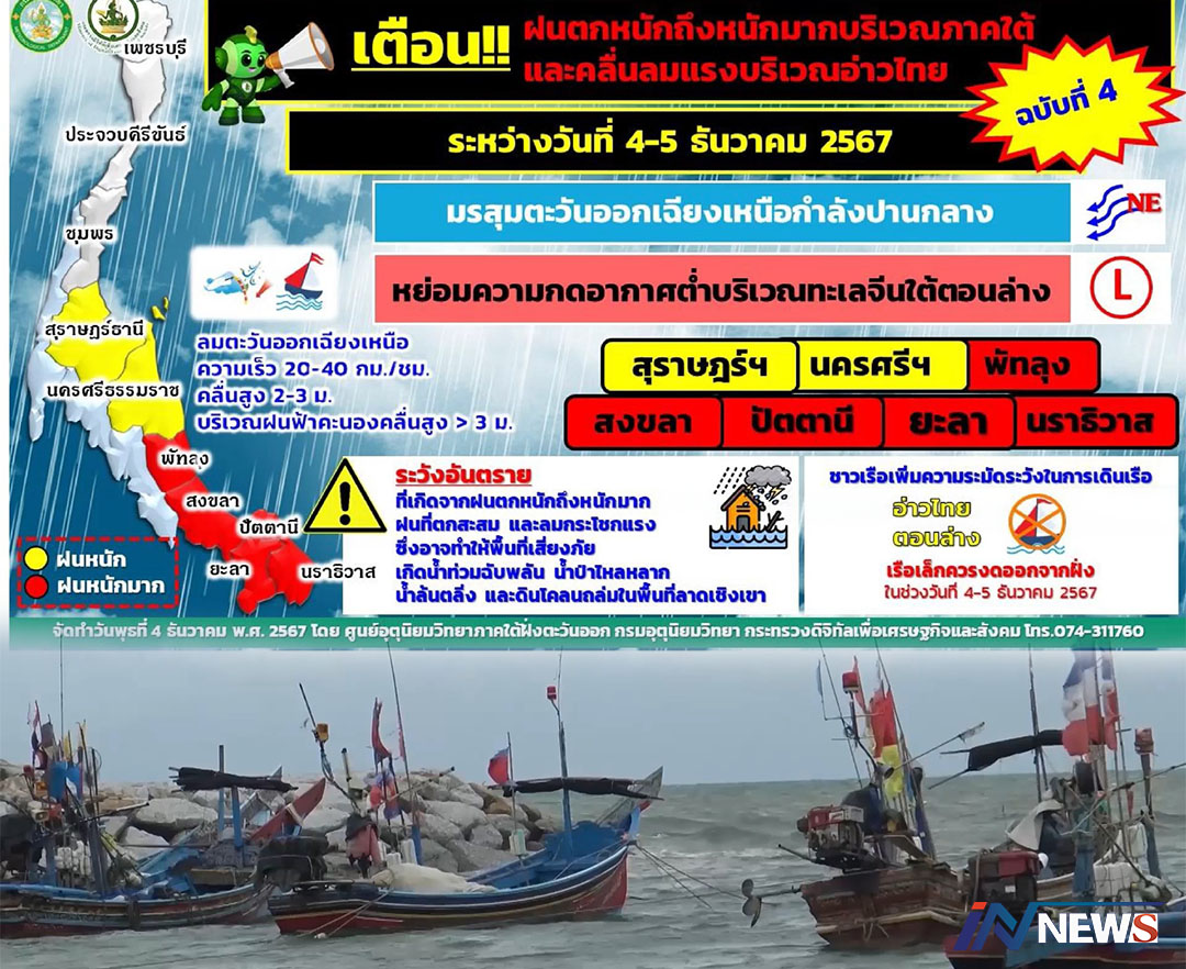 อุตุฯใต้เตือนมีฝนตกหนักฝั่งอ่าวไทยอีก ชาวประมงทยอยนำเรือเข้าฝั่ง4-5ธ.ค.นี้