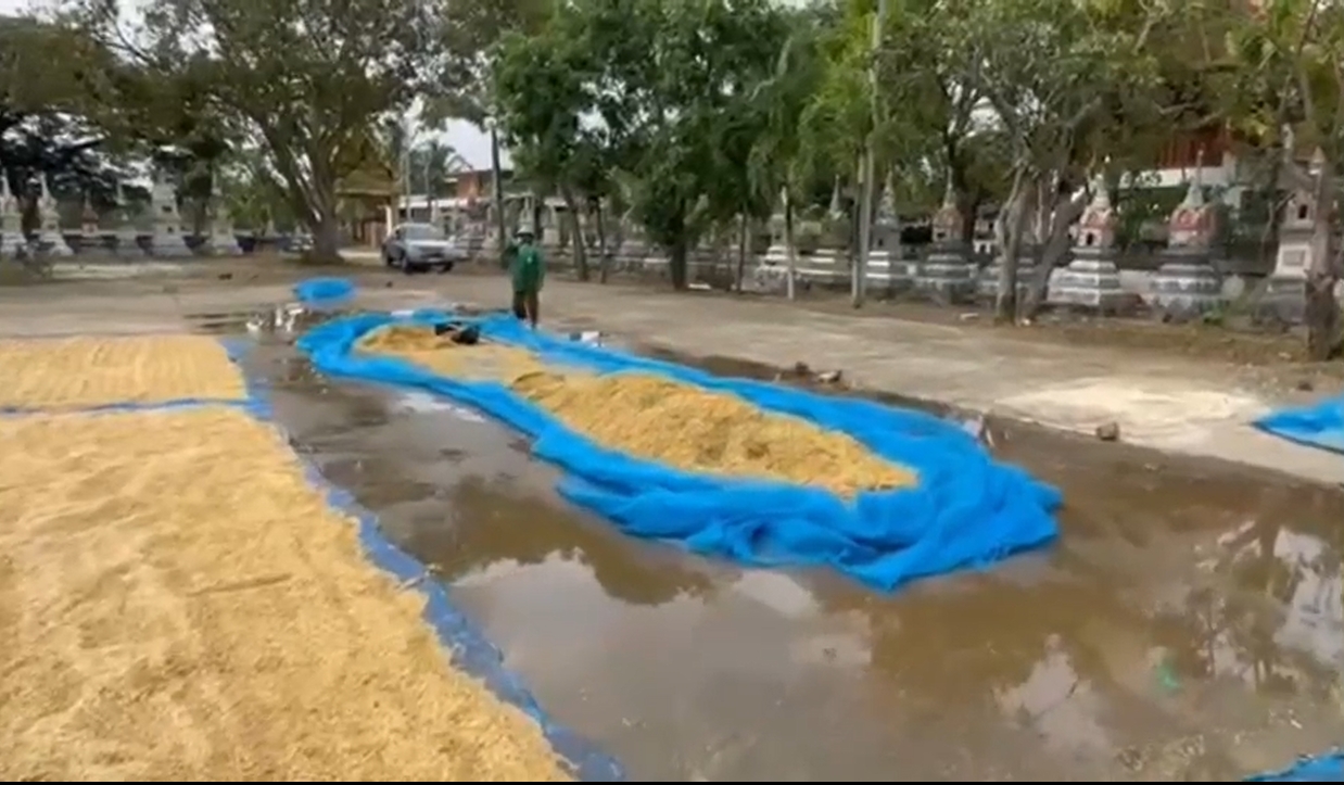 ชาวนาโอดฝนหลงฤดูถล่มลานตากข้าว เสียหายยับกลายเป็นข้าวเปียกในพริบตา