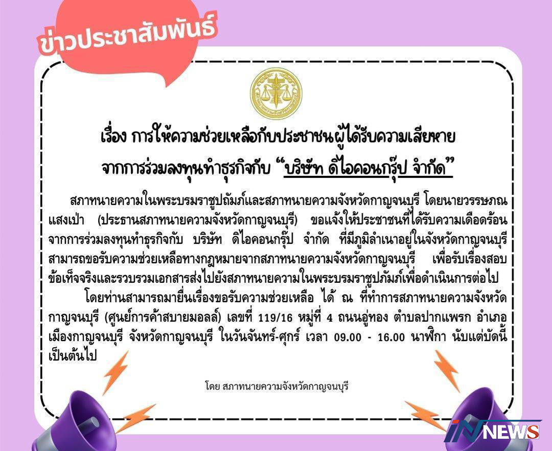 สภาทนายความกาญจน์ฯขึ้นป้ายรับเรื่อง ช่วยเหลือผู้เสียหายคดี'ดิไอคอนกรุ๊ป'