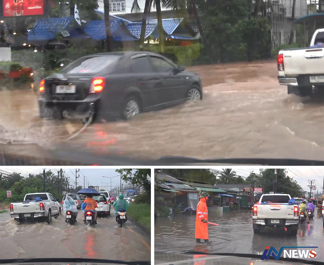 ฝนถล่มบ้านทุ่งลุงครึ่งชั่วโมงน้ำท่วมถนน เส้นทางกาญจนวานิชย์การจราจรติดขัด