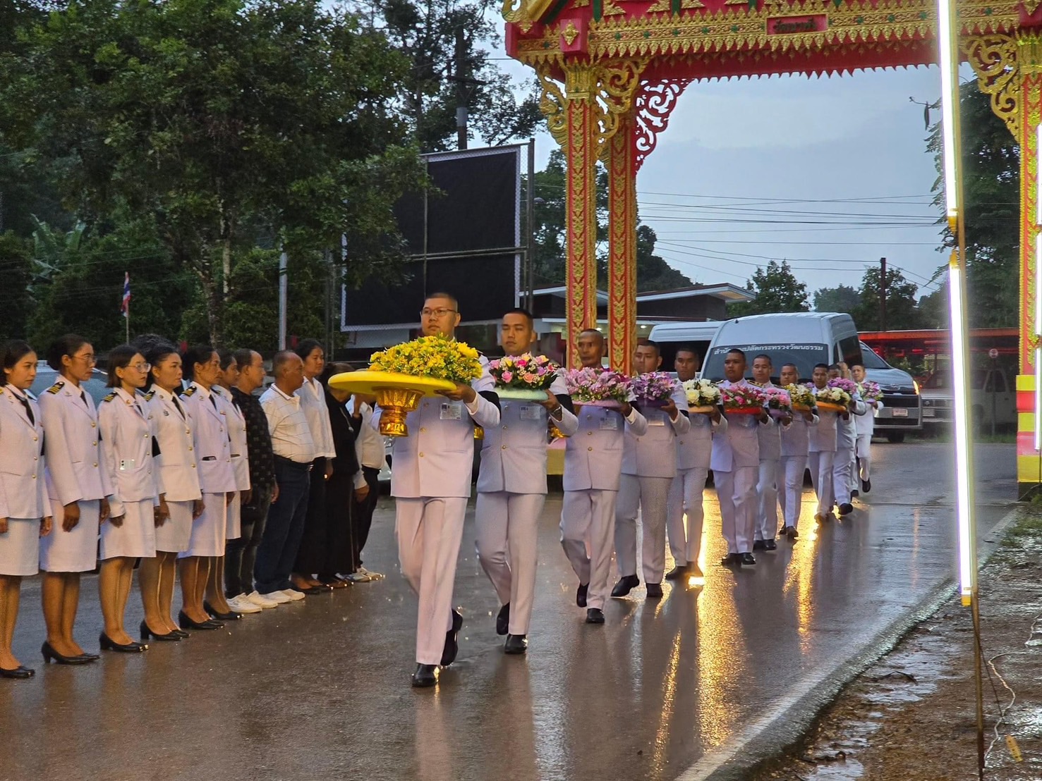 ร.ผว.สุราษฏร์เชิญพวงมาลาพระราชทาน วางที่หน้าหีบศพ'ดาบบรรเจิด พุทธเจริญ'