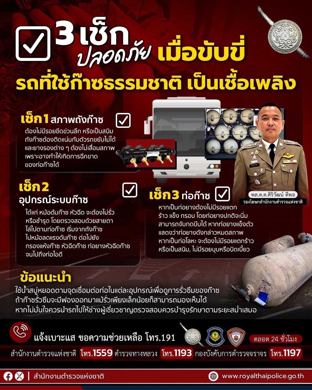 สตช.แนะขับขี่รถใช้ก๊าซต้องเช็กสถาพถัง ระบบก๊าซอยู่เสมอเพื่อความปลอดภัย