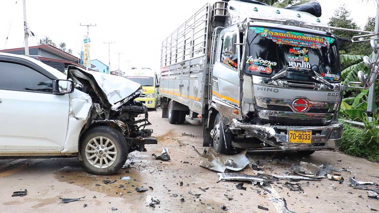 หนุ่มขับกระบะหักหลบจยย.พุ่งข้ามเลน ชนรถบรรทุก6ล้อเจ็บสาหัสกู้ภัยพาส่งรพ.