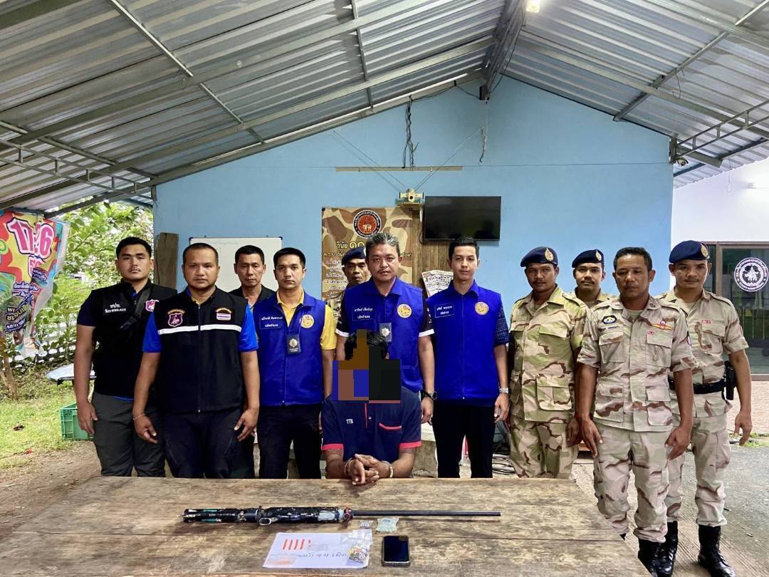 พังงา - เจ้าหน้าที่ชุดเฉพาะกิจฝ่ายปกครองร่วมกับเจ้าหน้าที่ตำรวจตระเวนชายแดน 425 จับผู้ต้องหายาเสพติดพร้อมอาวุธปืนยาวไทยป...