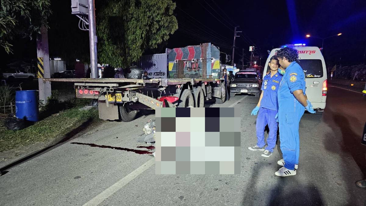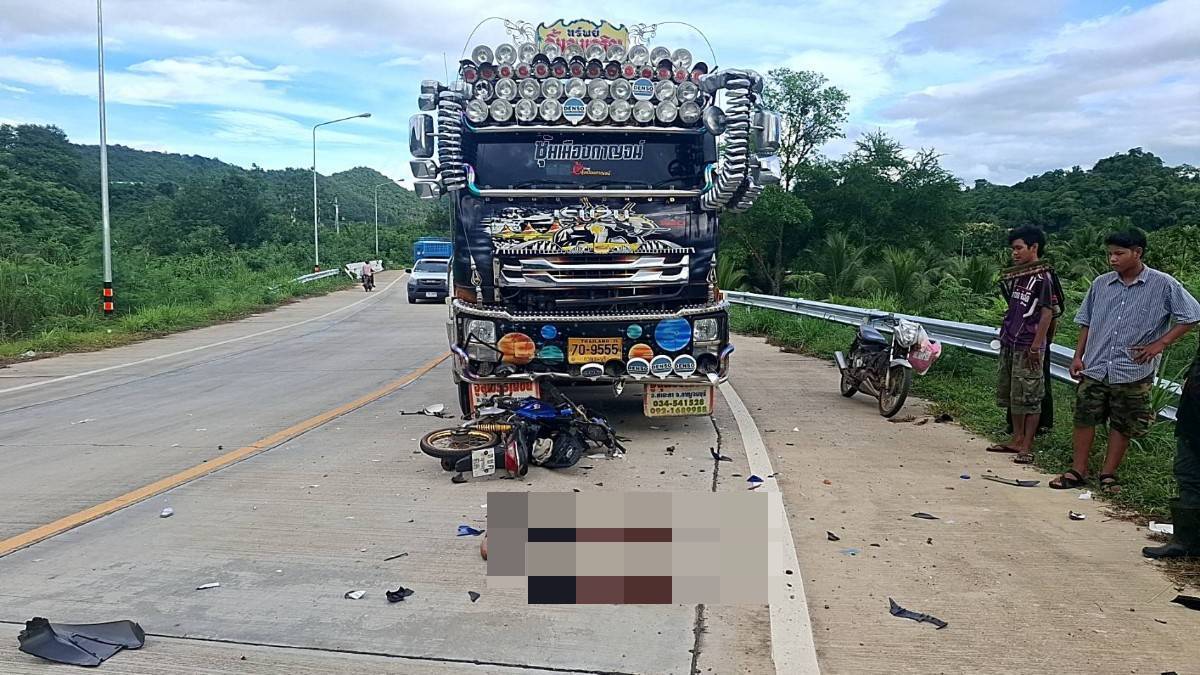ตูม!หนุ่มพม่าดับคาที่บนถนนห้วยน้ำขาว หลังควบจยย.หลุดโค้งเจอรถ10ล้อ