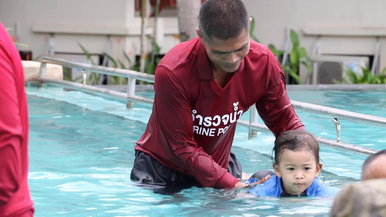 ตร.น้ำร่วมทต.ปากน้ำชุมพรฝึกน้องว่ายน้ำ ป้องกันการจมน้ำในเด็กปฐมวัย