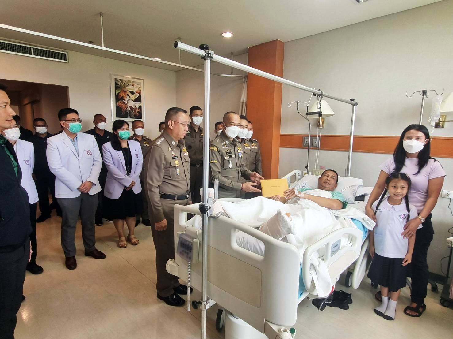 ผบ.ตร.พร้อมผบช.ภ.7รุดเยี่ยมให้กำลังใจ รองสว.มหาชัยบาดเจ็บจากจับตัวคนร้าย