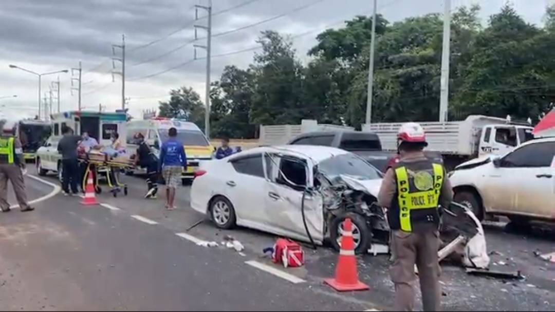 บุรีรัมย์-พื้นที่อำเภอเมืองเกิดเหตุรถเก๋งวิ่งมาด้วยความเร็ว แล้วพุ่งชนท้ายรถกระบะที่จอดรอไฟแดง 2 คันอย่างเต็มแรง หนึ่งใน...