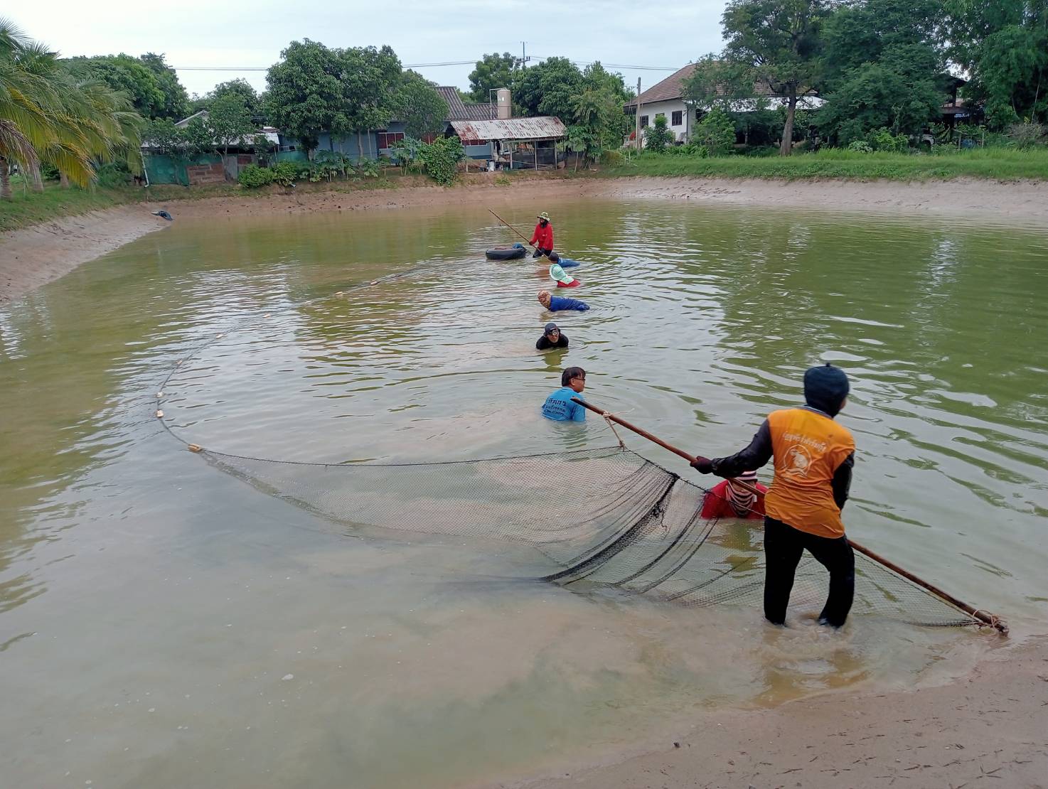กาฬสินธุ์-ยังบ่มี! กลุ่มเกษตรกรผู้เลี้ยงกุ้งก้ามกรามในอำเภอยางตลาด จังหวัดกาฬสินธุ์ ระดมแรงงานใช้อวนลากสำรวจหาปลาหมอคางด...