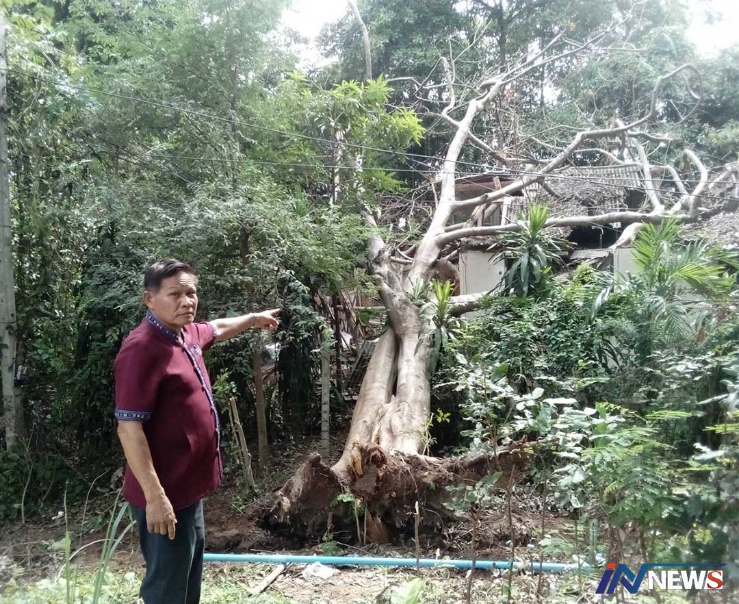 นายกทต.โพนทองนำจนท.-กฟภ.ลงพื้นที่ เก็บกู้ต้นไม้ล้มทับบ้านหวั่นไฟฟ้าช็อต