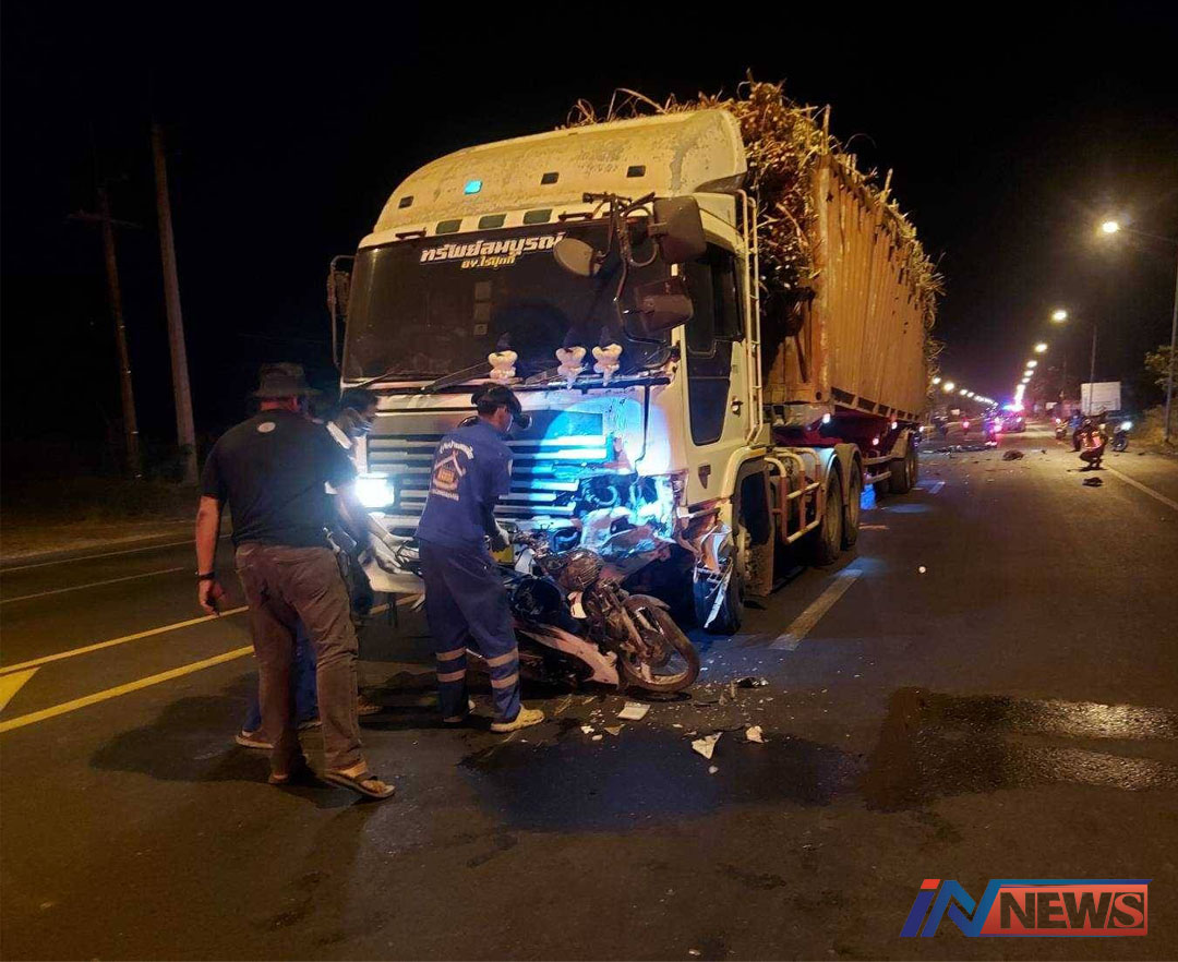 แม่ใจสลาย! ตามลูกชายช่วยขายแตงโม จยย.เสียหลักชนรถขนอ้อยดับสยอง