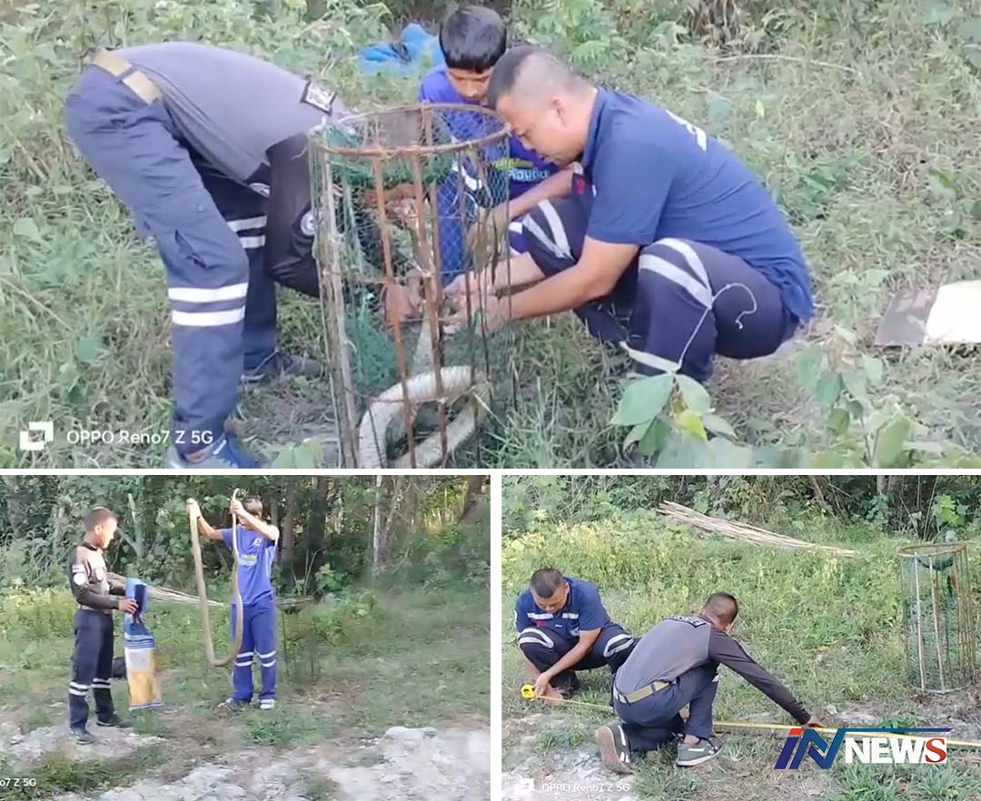 สงขลา-ตำรวจห้วยปลิง ไปหาหลักฐานฆ่าสองสามีภรรยาโหด พบจงอางตัวใหญ่ติดไซดักปลาของผู้ตาย จึงแจ้งทีมอสรพิษวิทยาภาคใต้มาจับ