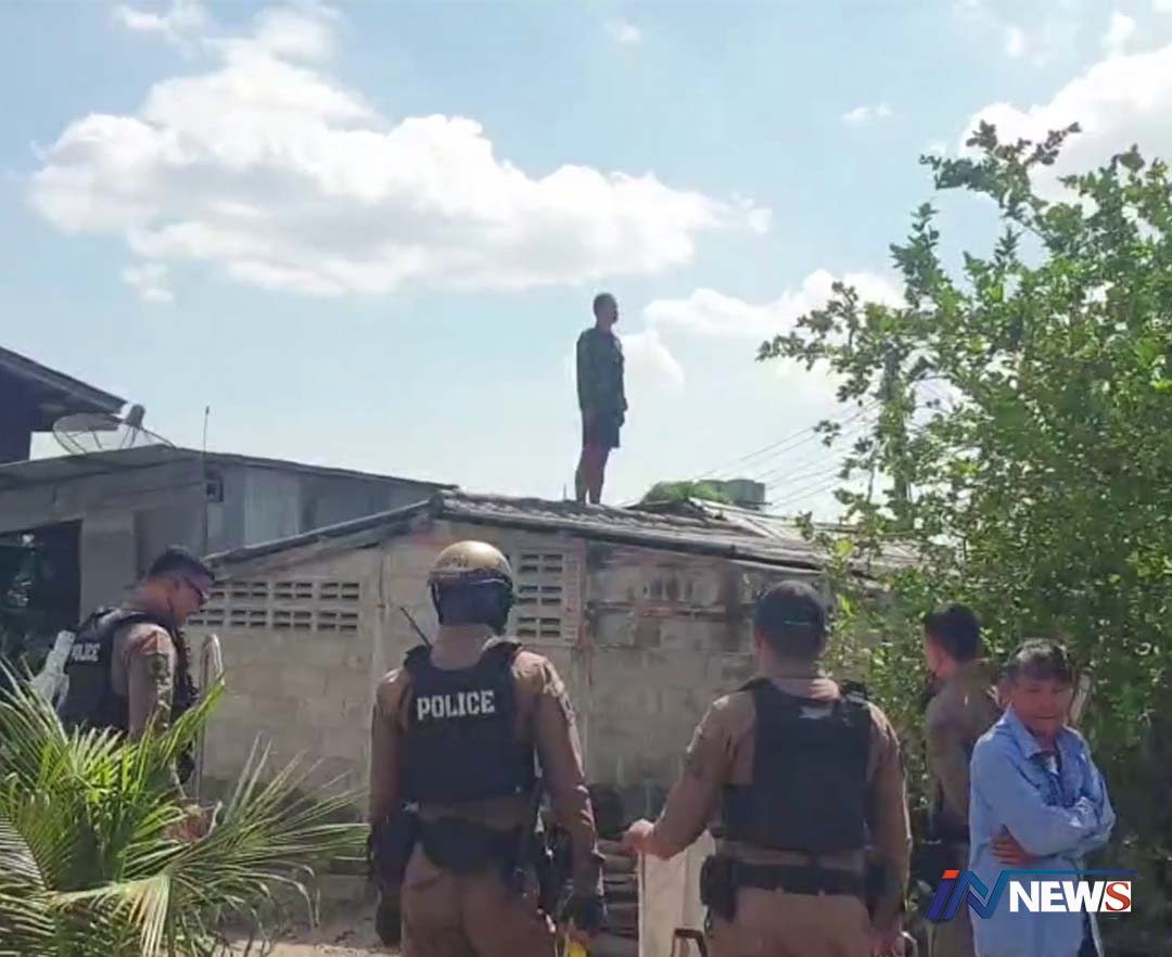 ตำรวจ-กู้ภัยรุดกล่อมหนุ่มคลั่งปีนหลังคา ร้องเพลงชาติสนั่นก่อนถูกพ่อหิวส่งตร.