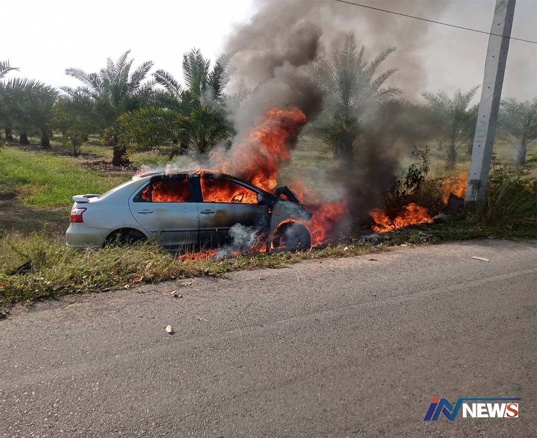 ครูสาววัย26หวิดย่างสดรถยนต์แหกโค้ง ชนเสาไฟจนไฟลุกท่วมโชคดีช่วยไว้ทัน