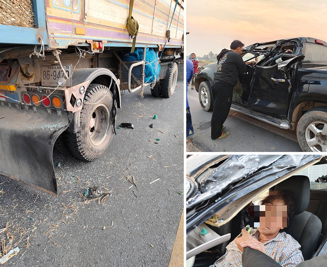 ระวังภัย!คนงานตัดอ้อยซิ่งรถกระบะชนตูม รถ18ล้อจอดยางรั่วดับคาที่1บาดเจ็บ1