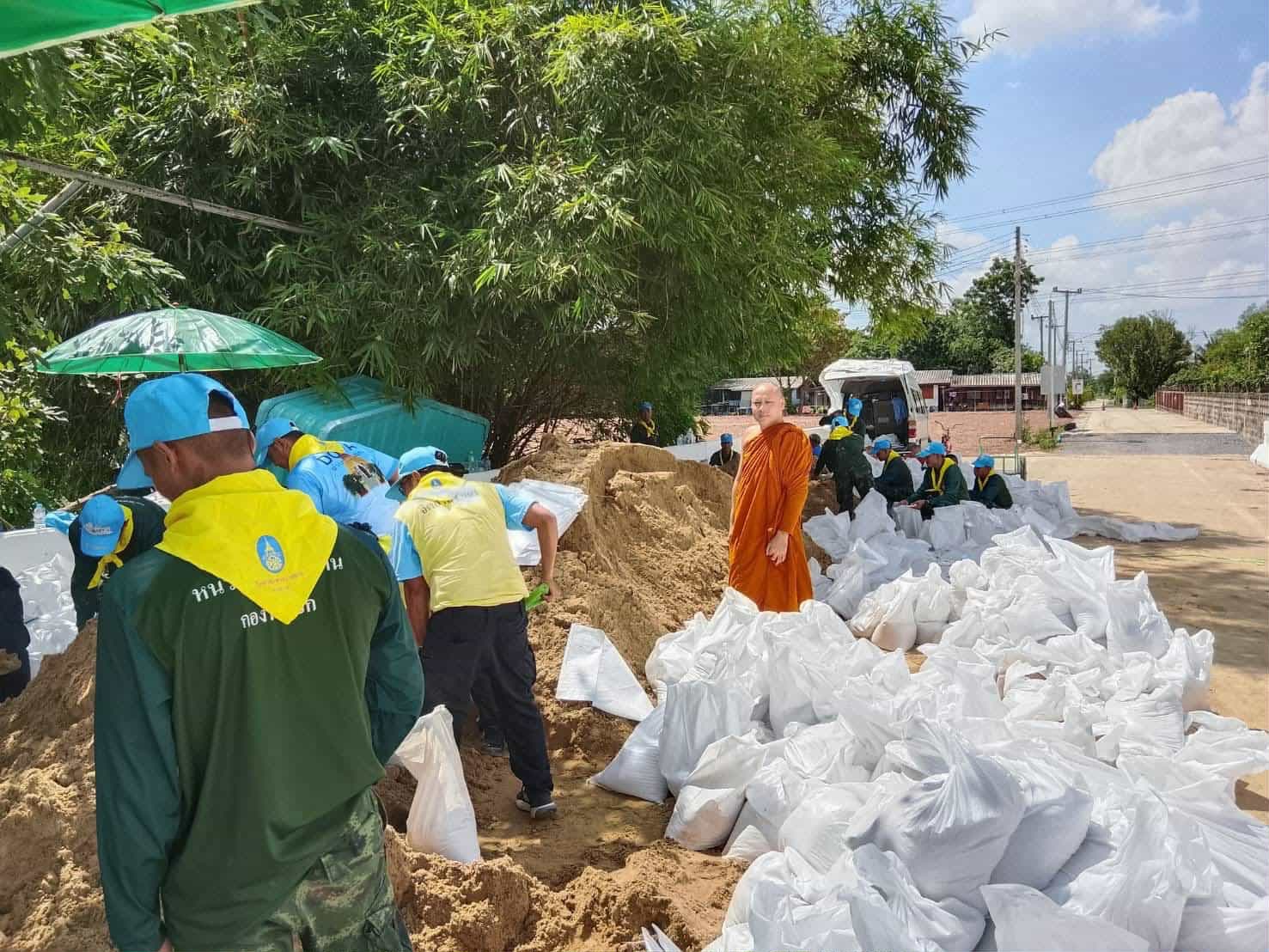 ตลาดน้ำวัดลำพญาเฝ้าระวังน้ำท่วมพื้นที่ นำกระสอบทราย8พันใบทำคันกั้นน้ำ