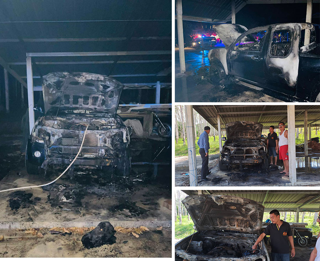 พังงา-ประหลาด เพลิงไหม้รถกระบะจอดในโรงรถข้างบ้านวอดทั้งคัน ชาวบ้านและกู้ภัยช่วยดับกันวุ่น
