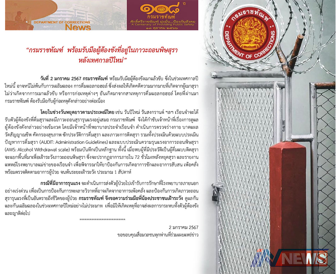 'กรมราชทัณฑ์'พร้อมรับมือผู้ต้องขังที่อยู่ ในภาวะถอนพิษสุราหลังเทศกาลปีใหม่