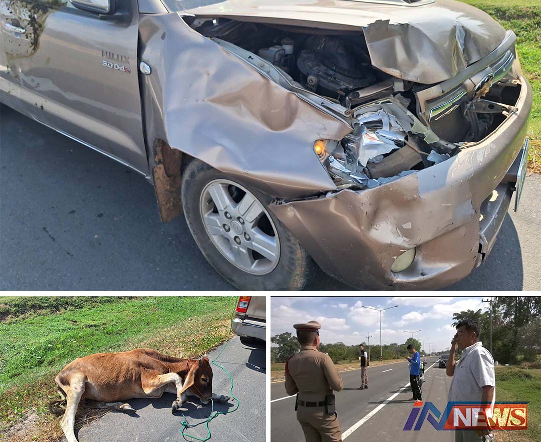 บุรีรัมย์-อำเภอกระสัง/กำนัน สุรินทร์ ขับรถจะกลับบ้านผ่านบุรีรัมย์ชนวัวอายุ 1 ปี รถพังยับตำรวจตรวจสอบระบุถ้าไม่มีเจ้าของว...