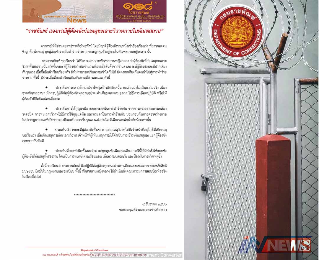 'กรมราชทัณฑ์'แจงกรณีผู้ต้องขังก่อเหตุ ทะเลาะวิวาทภายในทัณฑสถาน