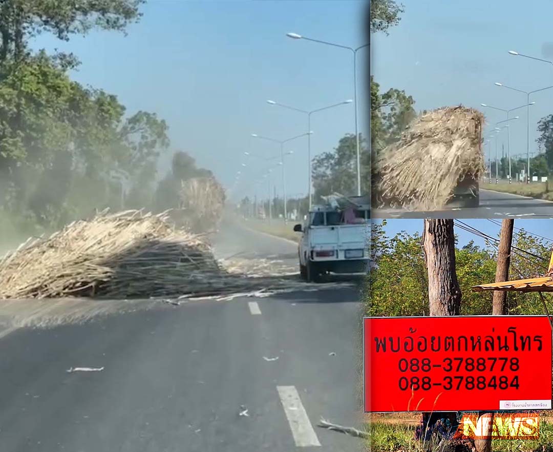 รถบรรทุกอ้อยมุกดาหารทำเสียวหวิดดับ ขับส่ายไปมาอ้อยหล่นหวิดทับรถตาม