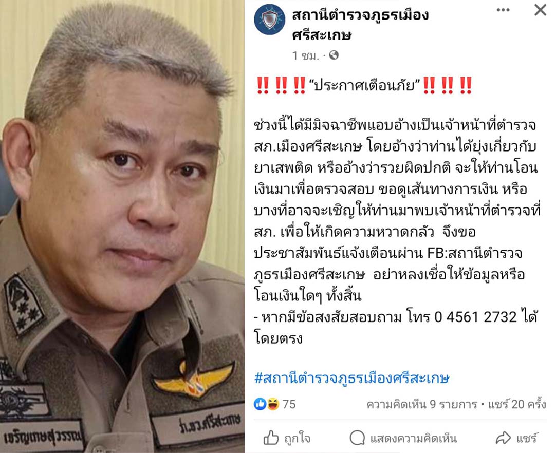 ผกก.เมืองศรีสะเกษเตือนภัยอย่าหลงเชื่อ ผู้อ้างเป็นตร.ข่มขู่ผิดกม.หลอกโอนเงิน