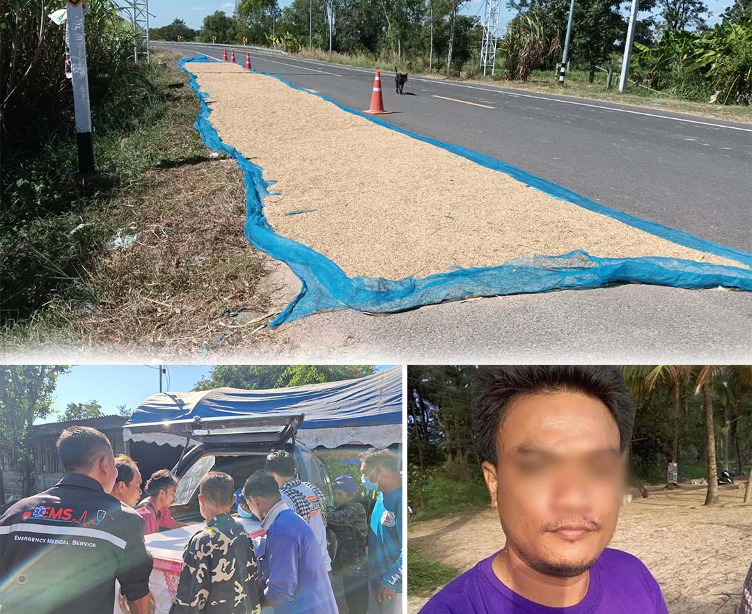ระวังภัย!ชาวนาที่ตากข้าวบนถนนหลวง หนุ่มซิ่งจยย.ไม่ระวังชนกองข้าวเปลือกดับ