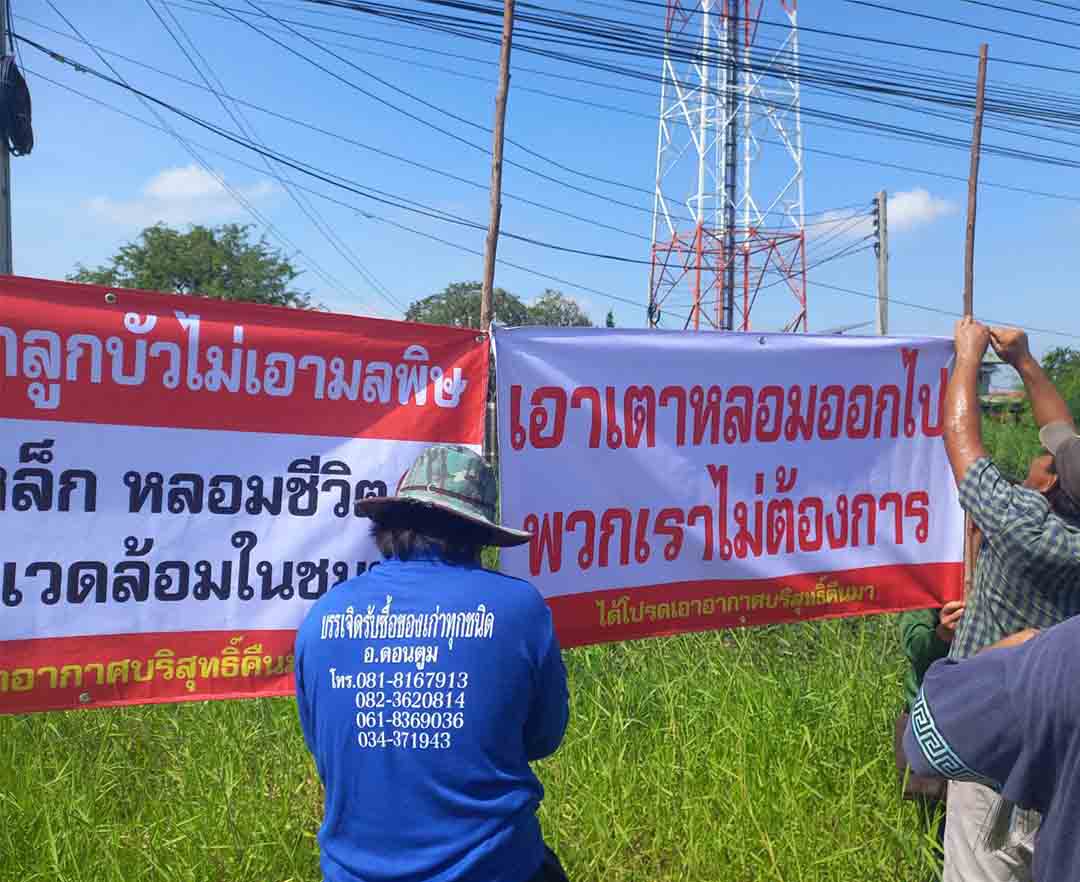ชาวดอนตูมไม่ทน!!นำลูกบ้านปักป้ายไล่ รง.หลอมโลหะปล่อยควันพิษมีคนล้มป่วย