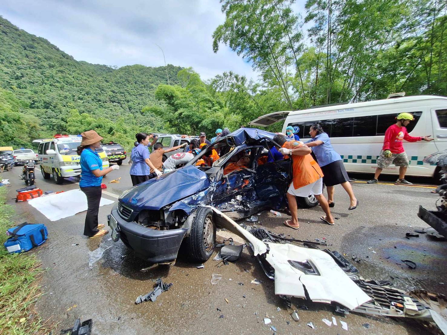 กาญจนบุรี-กาญจน์ ฝนตกถนนลื่น ! กระบะ-เก๋งชนกันที่ไทรโยค พระมรณภาพคาซาก 2 รูป ฆราวาสบาดเจ็บ 1 ราย