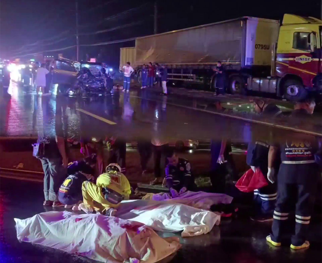 ฝนตกถนนลื่น!รถกระบะพุ่งข้ามเกาะกลาง อัดก็อปปี้รถเทลเลอร์ดับคาที่3ราย