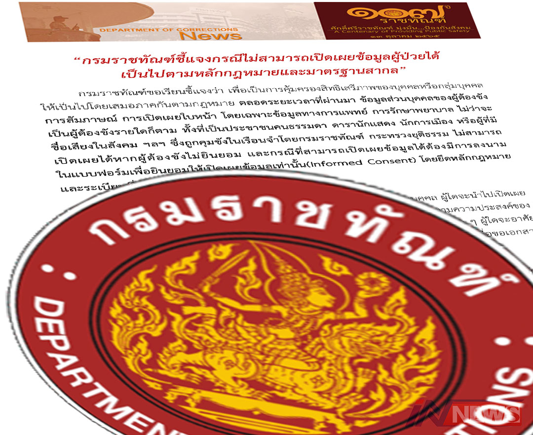 ราชทัณฑ์แจงเปิดเผยข้อมูลผู้ป่วยไม่ได้ เป็นไปตามหลักกม.และมาตรฐานสากล